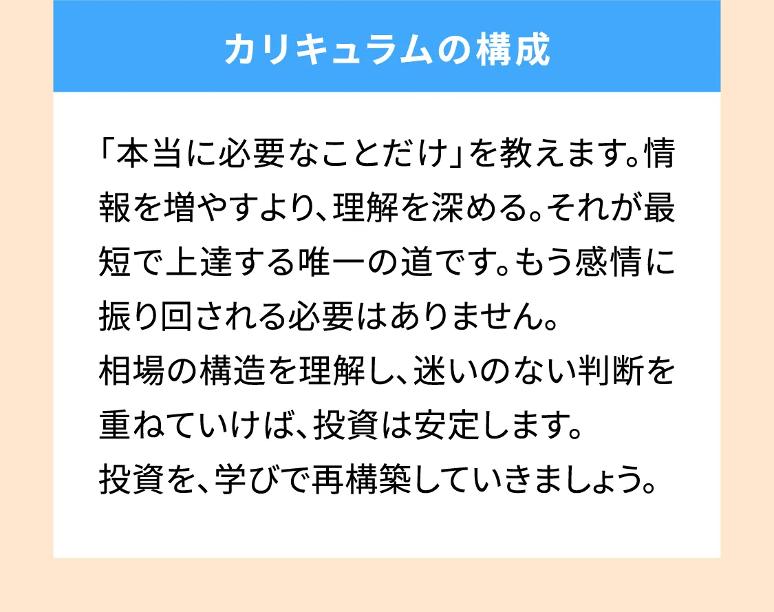 インターネット上には、投資に関する情報や教材があふれていますが、「正しい順番で基礎から体系的に学べる場」や、「疑問を気軽に聞ける環境」は、意外とありません。